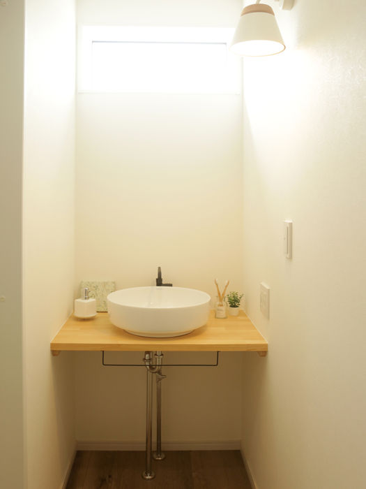 また造作洗面台にもこだわり、『木目と白いボウルと黒い蛇口がかわいい!窓の位置も完璧です。別で付けた照明もかわいくて見えるだけで癒しになります!』とこだわりのお家が完成しました。
